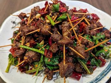 Our beef skewers feature premium rib meat, carefully seasoned to enhance its natural richness. Grilled to perfection, each skewer delivers a tender, juicy bite with a satisfying smoky char. The smokey beef is peppered with a unique blend of spices, including a hint of cumin, bringing out deep, savory flavors that make every skewer irresistible. Perfectly balanced, these skewers offer a bold, satiating experience, essence of traditional Chinese street food.